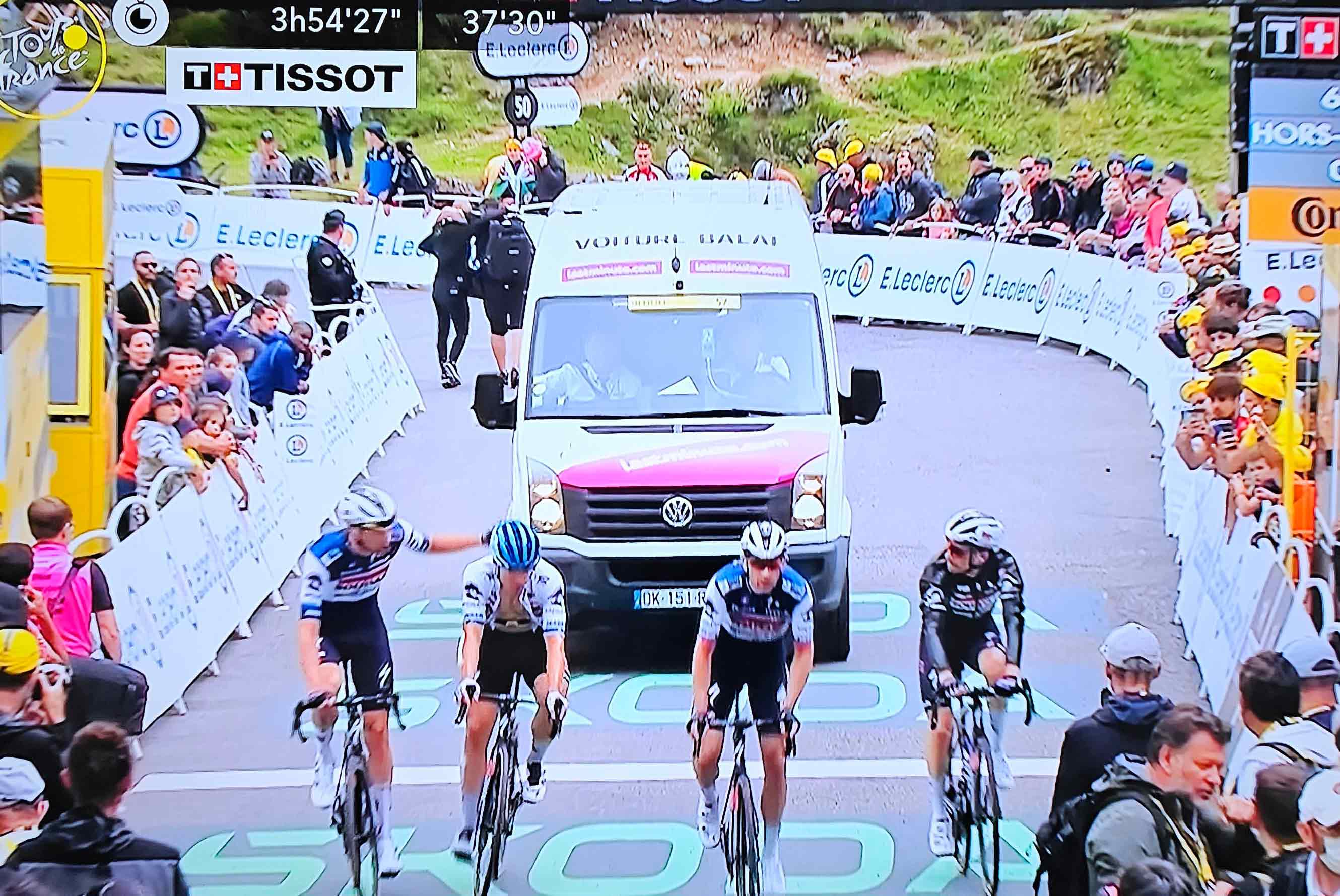 Rit 5: protestactie in peloton wegens gevaarlijke slotfase. Tijdsopname aan voet slotklim. 13 renners vooraan. Geprobeerd Tim Merlier naar voor te brengen vanuit het achtervolgend peloton, maar op dat moment versnelling vooraan.